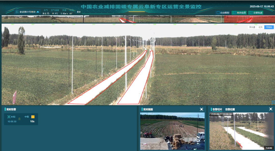 在零碳农业领域,研发团队对系统进行了针对性的升级调整。其一,节能方面,全景光电设备可采用太阳能等清洁能源,降低能耗,减少碳排放;其二,融合层面,设备能将全景图、预警数据,以及收集到的气温、土壤等数据提供给零碳农业管理平台,为零碳农业生产提供数据支撑;其三,共享维度,未来galaxy银河设备会把收集的所有数据同步传输给阜新市大数据局,为整个阜新市的农业决策提供数据支持。